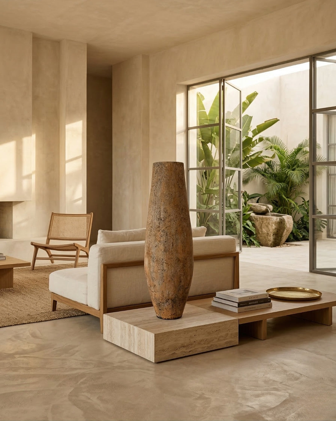 Smukła, rzeźbiarska waza o wyważonych proporcjach i szlachetnym wykończeniu w odcieniu postarzanej rdzy.
