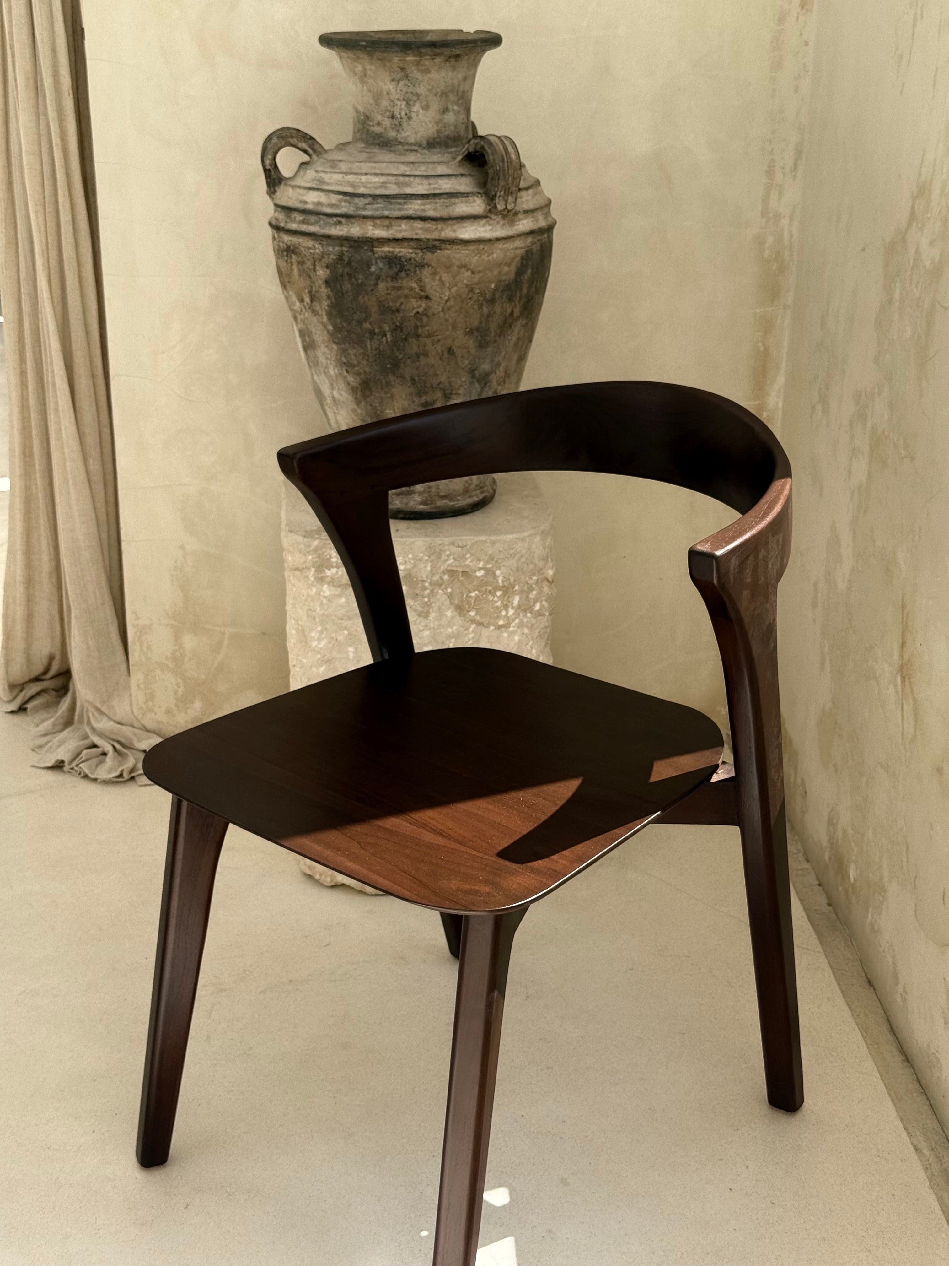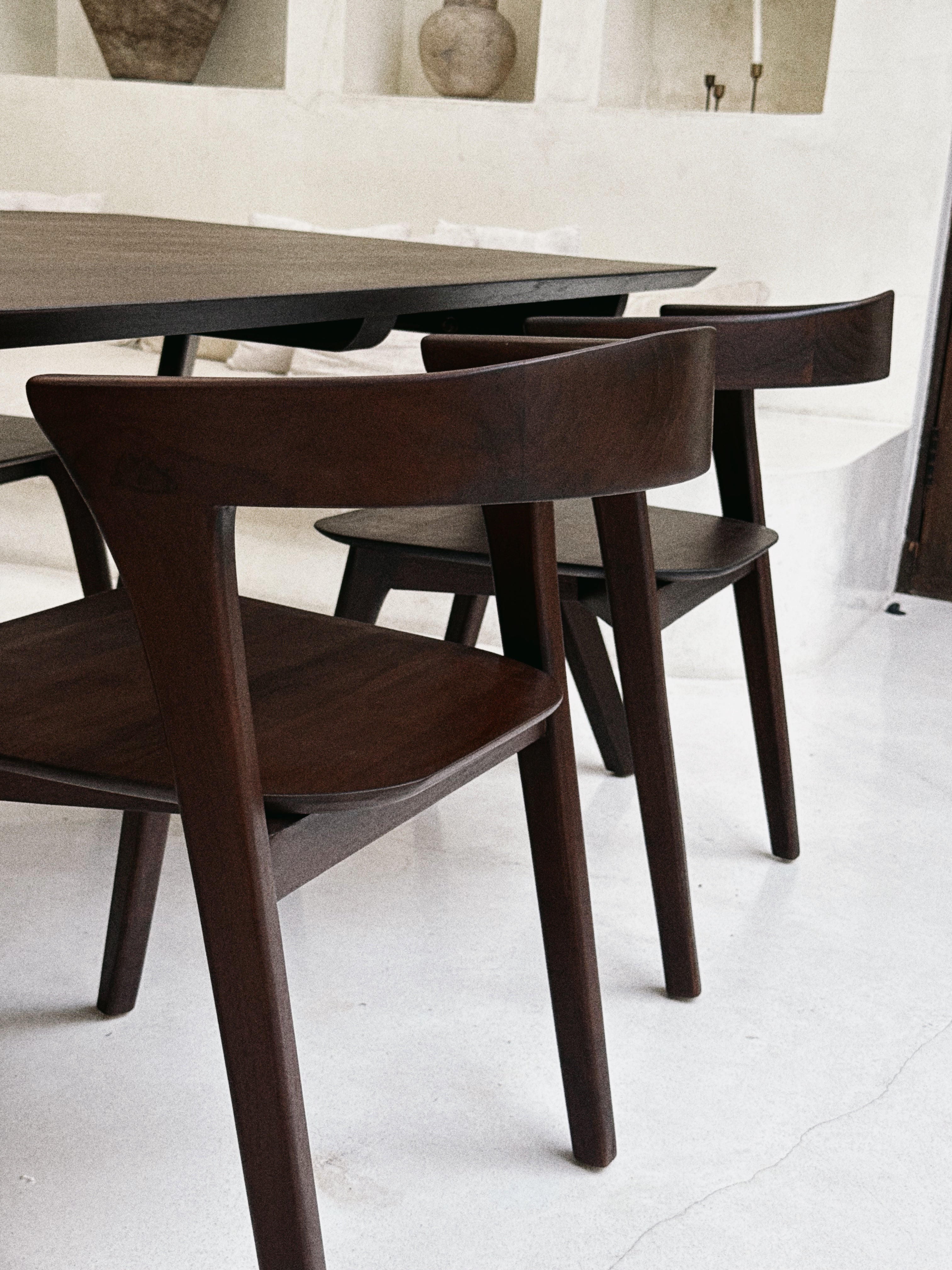 Solidny stół o perfekcyjnych proporcjach oraz cztery krzesła o miękkich, organicznych liniach tworzą spójną, spokojną kompozycję inspirowaną architekturą prywatnych willi na Bali.