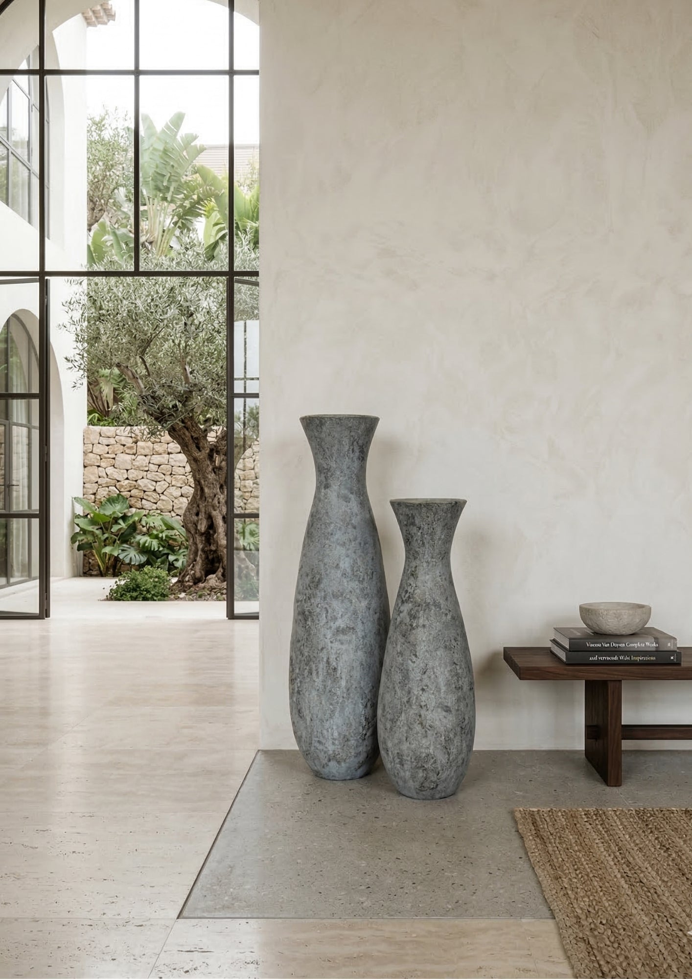 Smukły duet rzeźbiarskich waz o wydłużonej sylwetce i surowym wykończeniu inspirowanym naturalnym kamieniem.