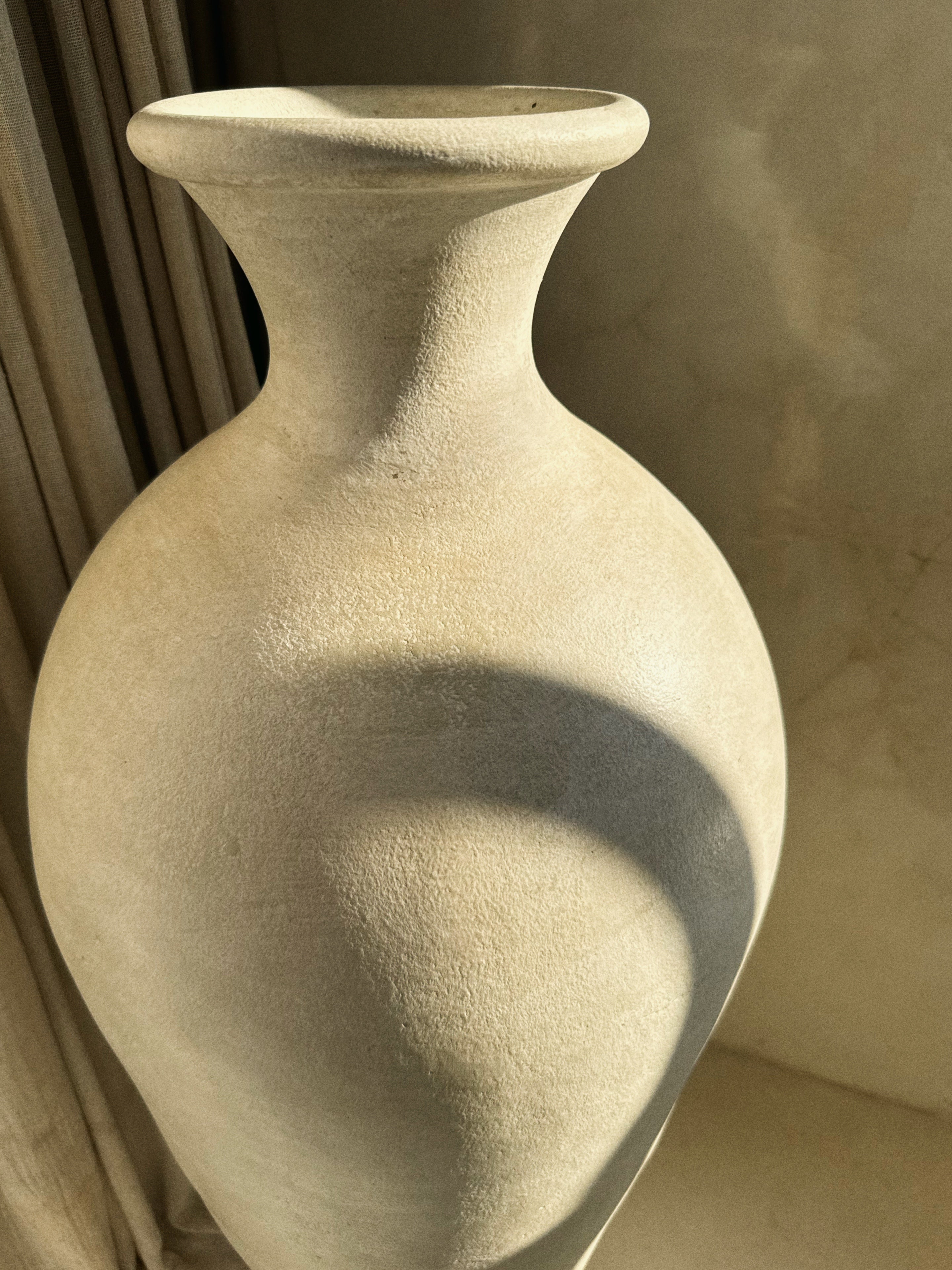 Ręcznie wykonana waza z terakoty o spokojnej, rzeźbiarskiej formie i matowym, piaskowym wykończeniu.
