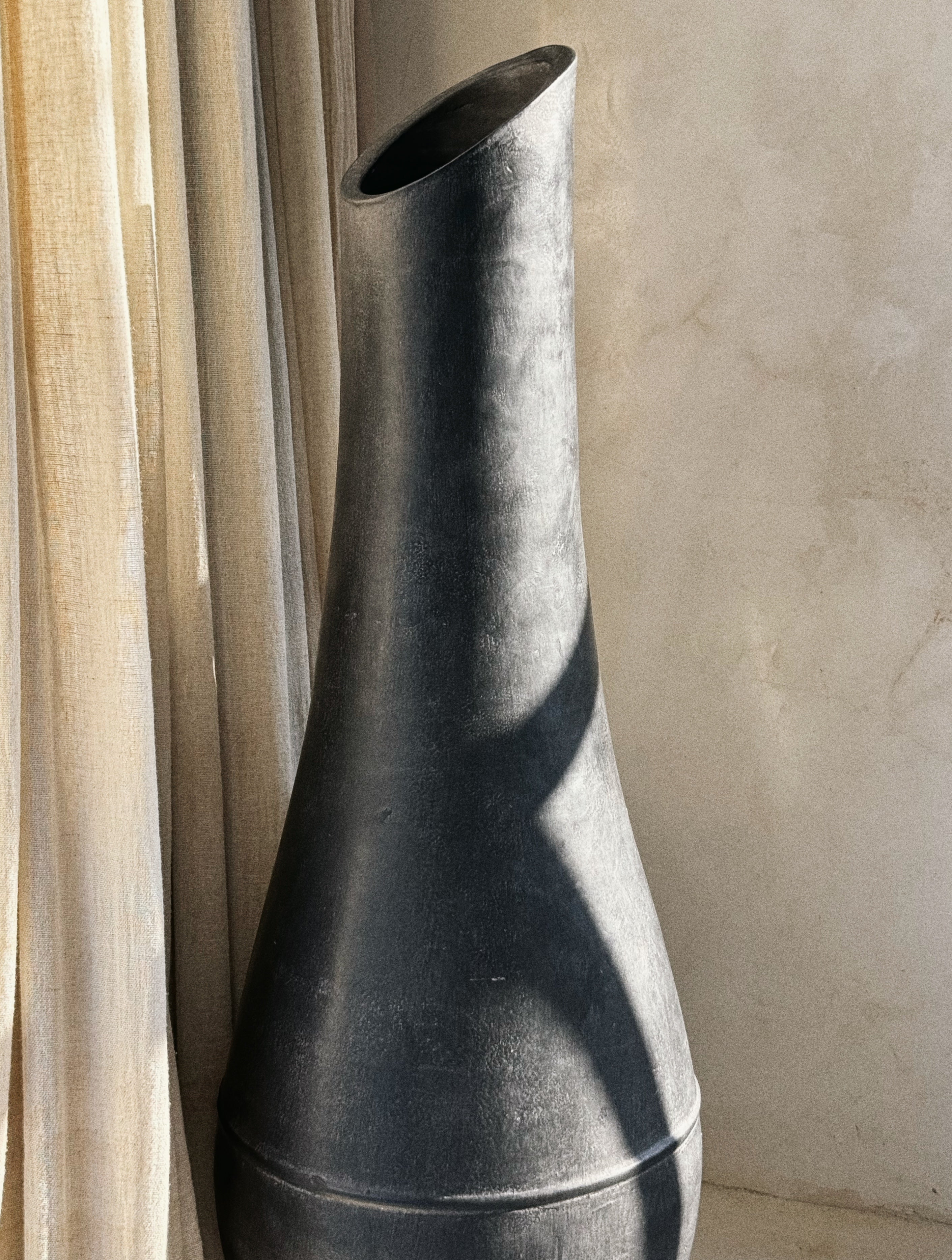Ręcznie wykonana waza z terakoty o smukłej, rzeźbiarskiej formie i matowym wykończeniu w głębokim, grafitowo-czarnym tonie.