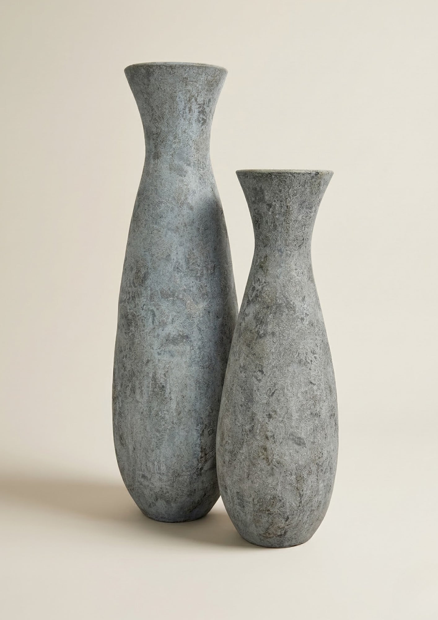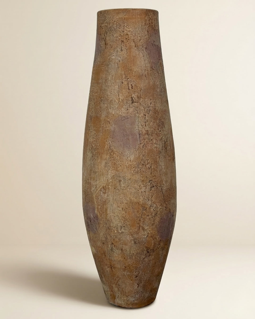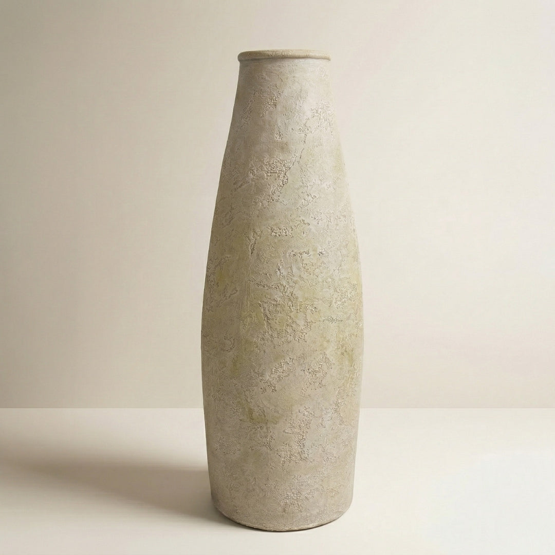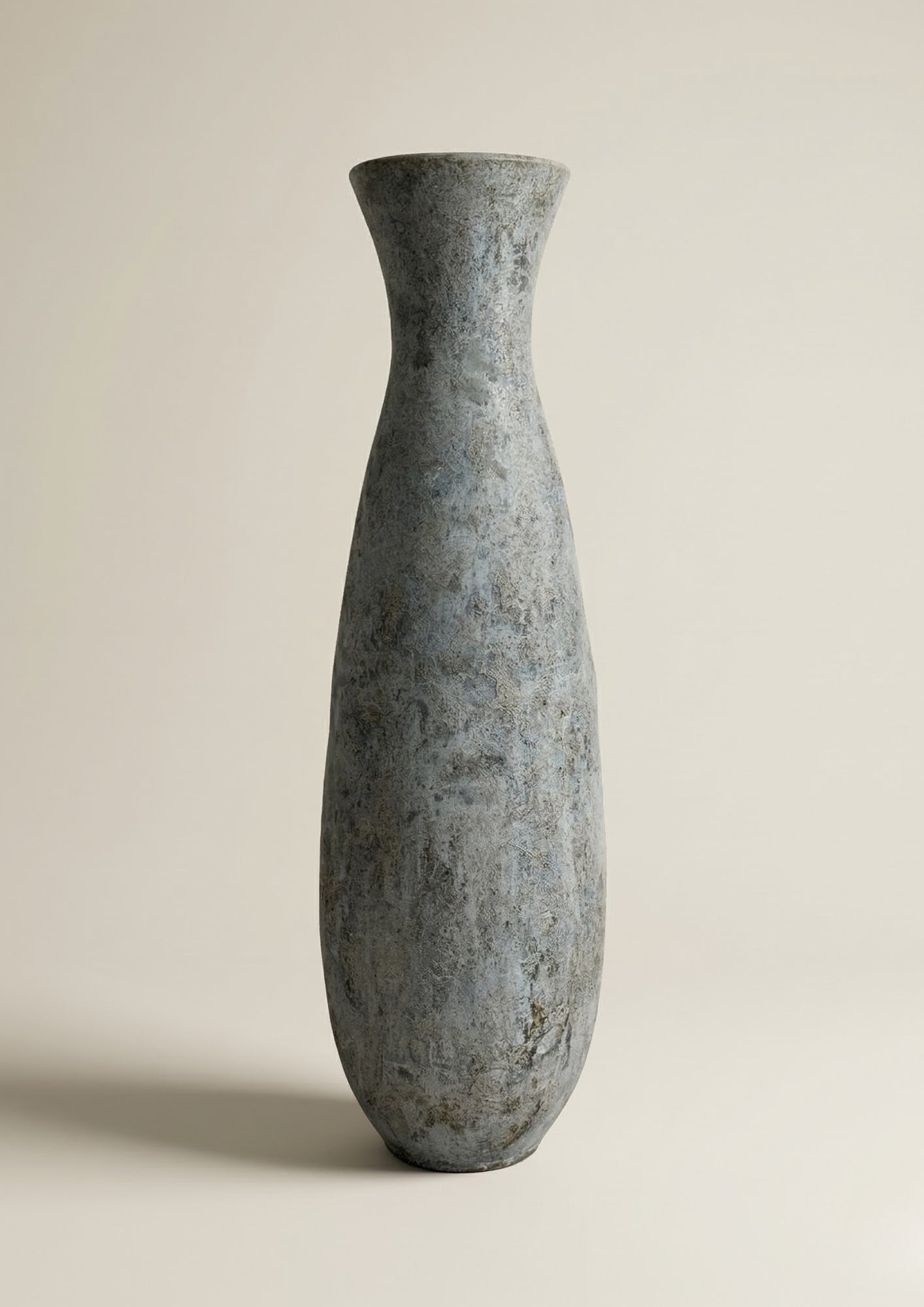 Smukła, rzeźbiarska waza o eleganckiej formie i subtelnym, mineralnym wykończeniu, które wnosi do wnętrza spokój i ponadczasowy charakter.