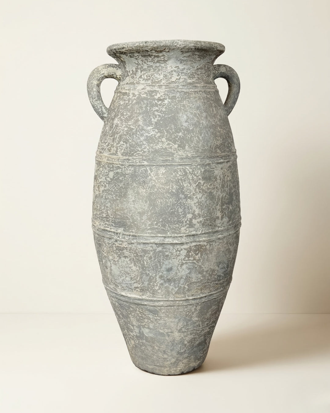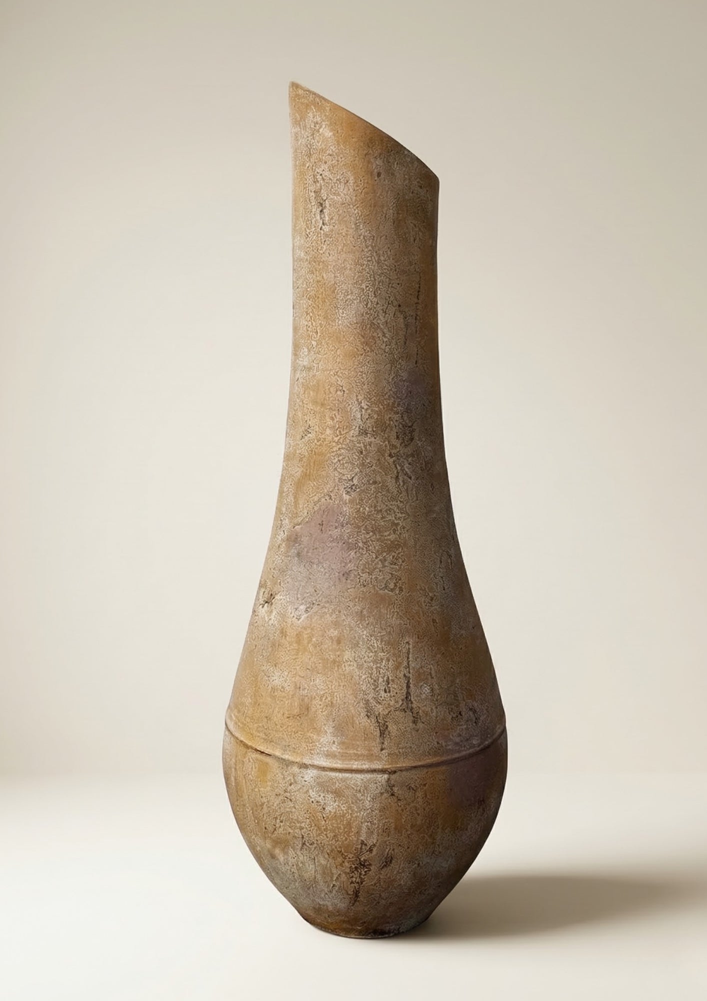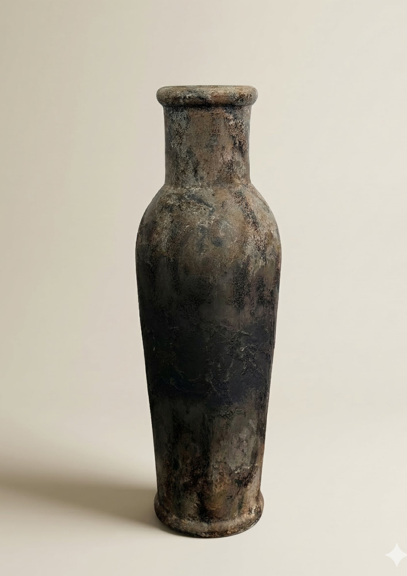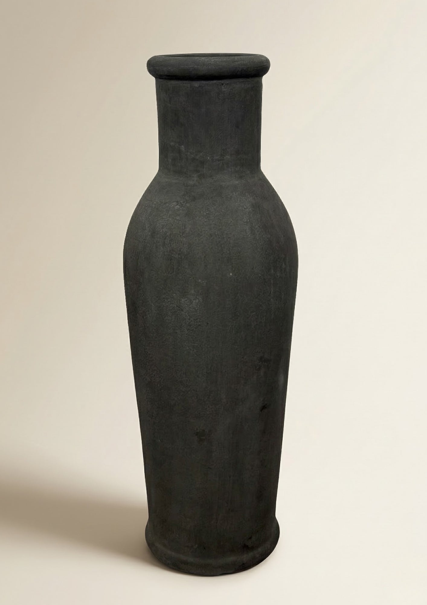 Smukła, rzeźbiarska waza o eleganckiej formie i subtelnym, mineralnym wykończeniu, które wnosi do wnętrza spokój i ponadczasowy charakter.